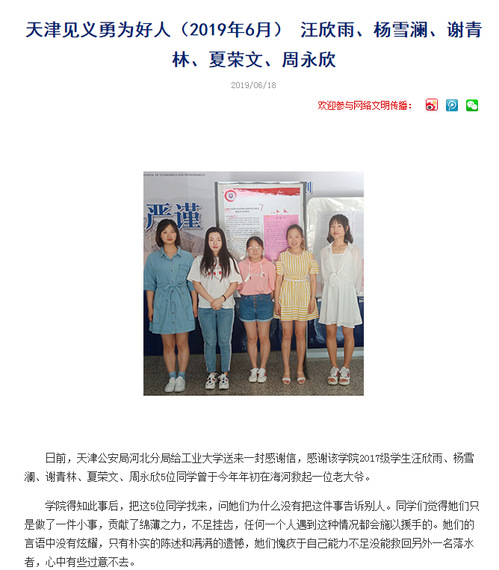 2019年6月18日,《天津文明网》以《天津见义勇为好人(2019年6月) 汪欣雨、杨雪澜、谢青林、夏荣文、周永欣》为题对我校做了报道,现将全文转发如下,以飨读者。