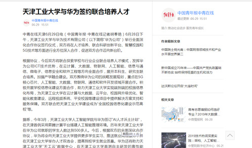 2019年6月29日,中青在线以《天津工业大学与华为签约联合培养人才》为题对我校做了报道,现将全文转发如下,以飨读者。