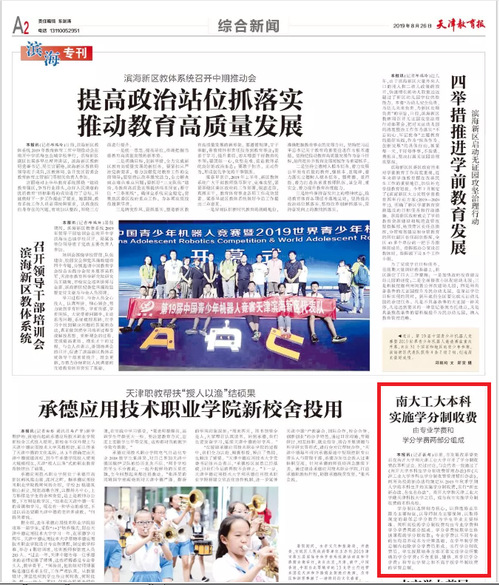 2019年8月26日天津教育报A2版以《南大工大本科实施学分制收费——由专业学费和学分学费两部分组成》对我校做了报道。现将全文转发如下,以飨读者。