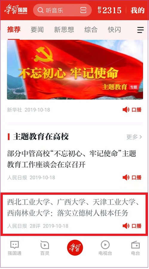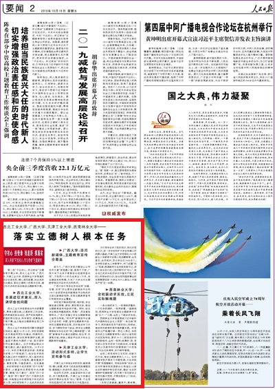 2019年10月18日,《人民日报》2版“守初心 担使命 找差距 抓落实·深入开展‘不忘初心、牢记使命’主题教育”专栏,以《西北工业大学、广西大学、天津工业大学、西南林业大学——落实立德树人根本任务》为题对我校做了报道,学习强国平台“推荐”专栏做了转发。现将全文转发如下,以飨读者。