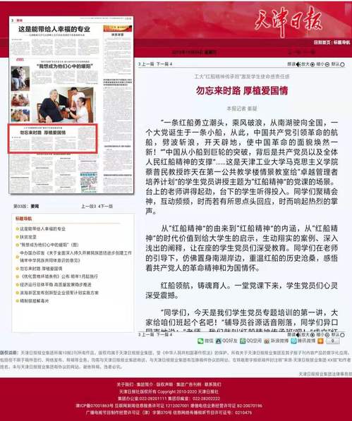 2019年10月24日天津日报第03版以《工大“红船精神传承班”激发学生使命感责任感——勿忘来时路 厚植爱国情》对我校做了报道。现将全文转发如下,以飨读者。