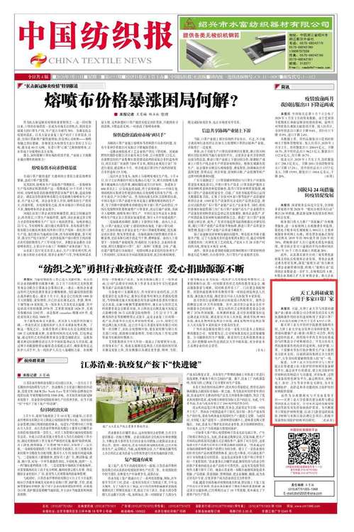 2020年3月11日《中国纺织报》第1版以《天工大科研成果 应用于多家口罩厂家》对我校做了报道。现将全文转发如下,以飨读者。