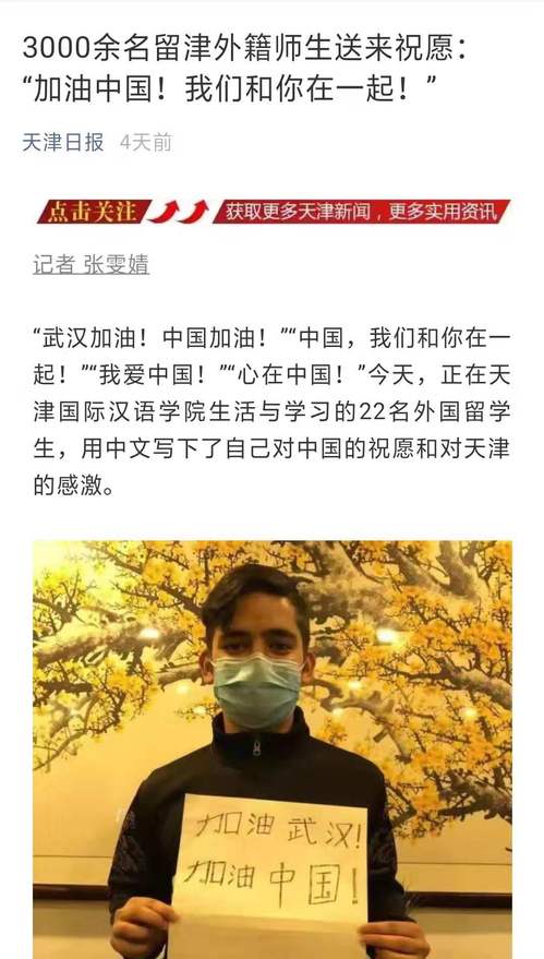 2020年2月2日《天津日报》以《3000余名留津外籍师生送来祝愿: “加油中国!我们和你在一起!》对我校做了报道。现将全文转发如下,以飨读者。