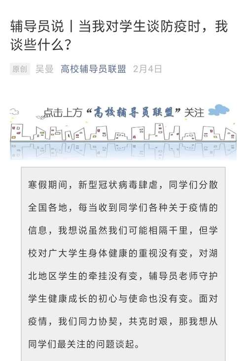 2020年2月4日高校辅导员联盟微信客户端以《辅导员说丨当我对学生谈防疫时,我谈些什么?》对我校做了报道。现将全文转发如下,以飨读者。