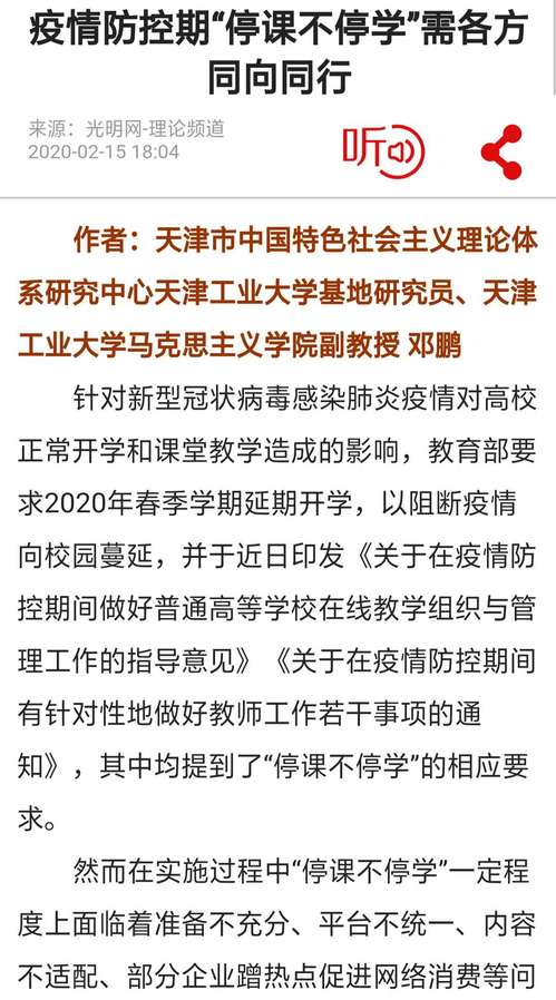 然而在实施过程中“停课不停学”一定程度上面临着准备不充分、平台不统一、内容不适配、部分企业蹭热点促进网络消费等问题。对此,涉及的各方要正确理解政策的初衷,并根据相关要求各司其职、同向发力,共克时艰,才实现功效最大化。