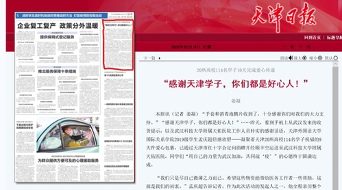 2020年2月18日《天津日报》第05版以《20所高校114名学子10天完成爱心传递“感谢天津学子,你们都是好心人!”》对我校做了报道。现将全文转发如下,以飨读者。