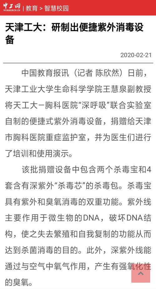 2020年2月21日中工网以《天津工大:研制出便捷紫外消毒设备》对我校做了报道。现将全文转发如下,以飨读者。