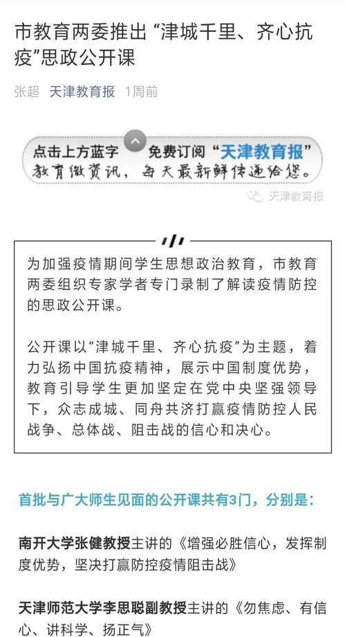 2020年2月23日《天津教育报》微信客户端以《市教育两委推出 “津城千里、齐心抗疫”思政公开课》对我校做了报道。现将全文转发如下,以飨读者。