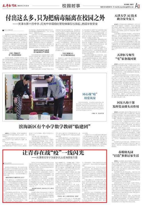 2020年2月26日《天津教育报》第A3版以《让青春在战“疫”一线闪光——天津高校学子为家乡抗击疫情贡献力量》对我校做了报道。现将全文转发如下,以飨读者。
