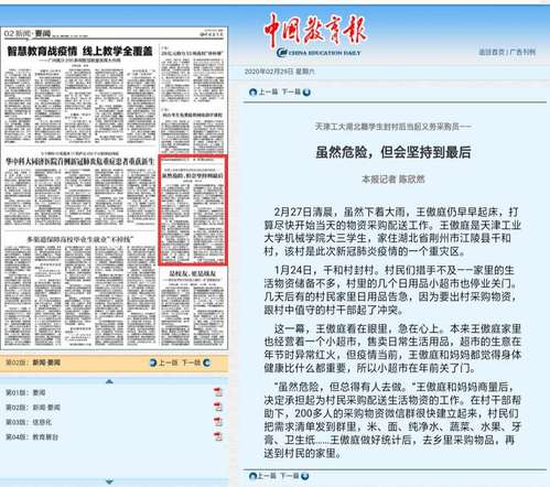 2020年2月29日《中国教育报》第02版以《天津工大湖北籍学生封村后当起义务采购员——虽然危险,但会坚持到最后》对我校做了报道。现将全文转发如下,以飨读者。