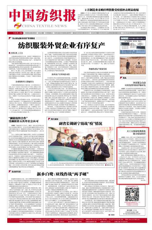 2020年3月4日《中国纺织报》第1版以《天工大体温监测系统 助力疫情防控》对我校做了报道。现将全文转发如下,以飨读者。