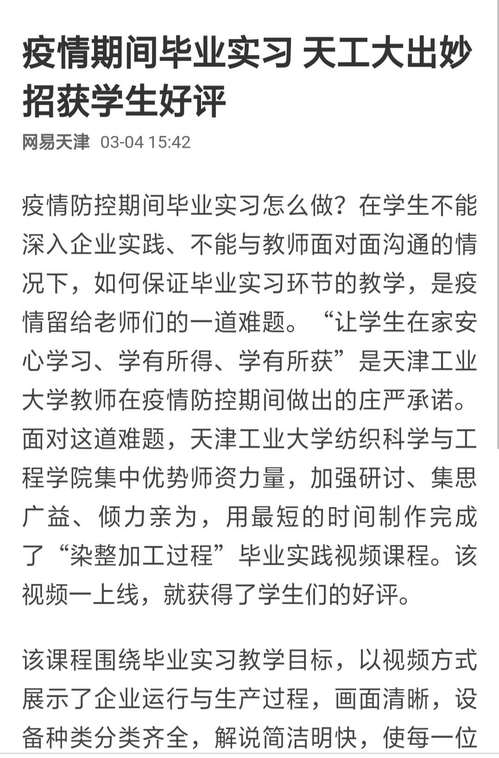 2020年3月4日网易天津微信客户端以《疫情期间毕业实习 天工大出妙招获学生好评》对我校做了报道。现将全文转发如下,以飨读者。
