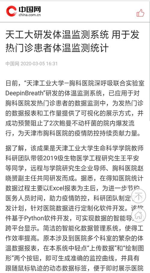 2020年3月5日中国网微信客户端以《天工大研发体温监测系统 用于发热门诊患者体温监测统计》对我校做了报道。现将全文转发如下,以飨读者。