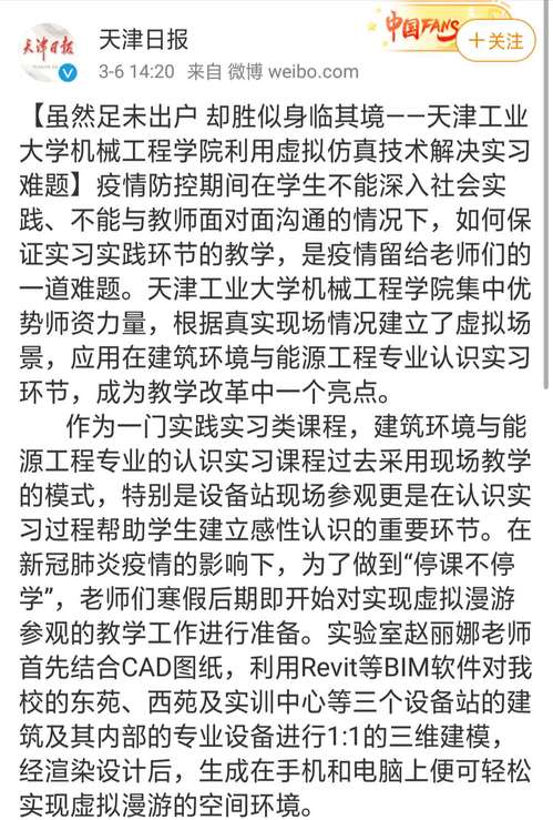 2020年3月6日天津日报官方微博以《虽然足未出户 却胜似身临其境——天津工业大学机械工程学院利用虚拟仿真技术解决实习难题》对我校做了报道。现将全文转发如下,以飨读者。