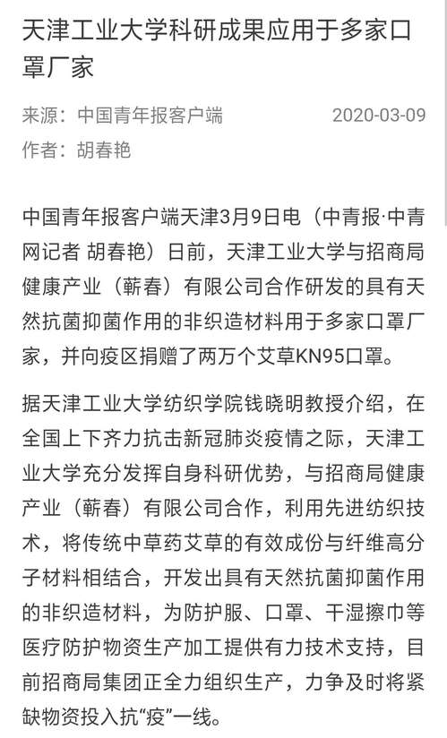 中国青年报客户端天津3月9日电(中青报·中青网记者 胡春艳)日前,天津工业大学与招商局健康产业(蕲春)有限公司合作研发的具有天然抗菌抑菌作用的非织造材料用于多家口罩厂家,并向疫区捐赠了两万个艾草KN95口罩。