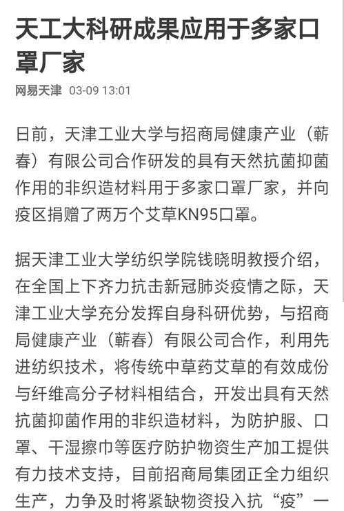 据天津工业大学纺织学院钱晓明教授介绍,在全国上下齐力抗击新冠肺炎疫情之际,天津工业大学充分发挥自身科研优势,与招商局健康产业(蕲春)有限公司合作,利用先进纺织技术,将传统中草药艾草的有效成份与纤维高分子材料相结合,开发出具有天然抗菌抑菌作用的非织造材料,为防护服、口罩、干湿擦巾等医疗防护物资生产加工提供有力技术支持,目前招商局集团正全力组织生产,力争及时将紧缺物资投入抗“疫”一线。