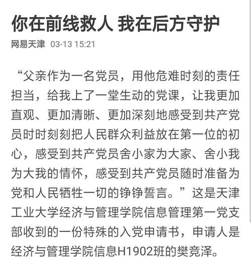 “父亲作为一名党员,用他危难时刻的责任担当,给我上了一堂生动的党课,让我更加直观、更加清晰、更加深刻地感受到共产党员时时刻刻把人民群众利益放在第一位的初心,感受到共产党员舍小家为大家、舍小我为大我的情怀,感受到共产党员随时准备为党和人民牺牲一切的铮铮誓言。”这是天津工业大学经济与管理学院信息管理第一党支部收到的一份特殊的入党申请书,申请人是经济与管理学院信息H1902班的樊竞泽。