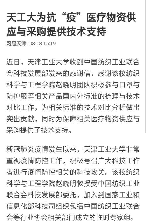 新冠肺炎疫情发生以来,天津工业大学非常重视疫情防控工作,积极号召广大科技工作者进行疫情防控相关的科技攻关。该校纺织科学与工程学院赵晓明教授受中国纺织工业联合会科技发展部委托,加入到国家工业和信息化部科技司组织包括中国纺织工业联合会等行业协会相关部门成立的临时专家组。
