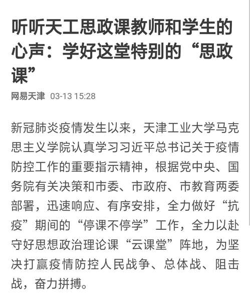 2020年3月13日网易新闻微信客户端以《听听天工思政课教师和学生的心声:学好这堂特别的“思政课”》对我校做了报道。现将全文转发如下,以飨读者。