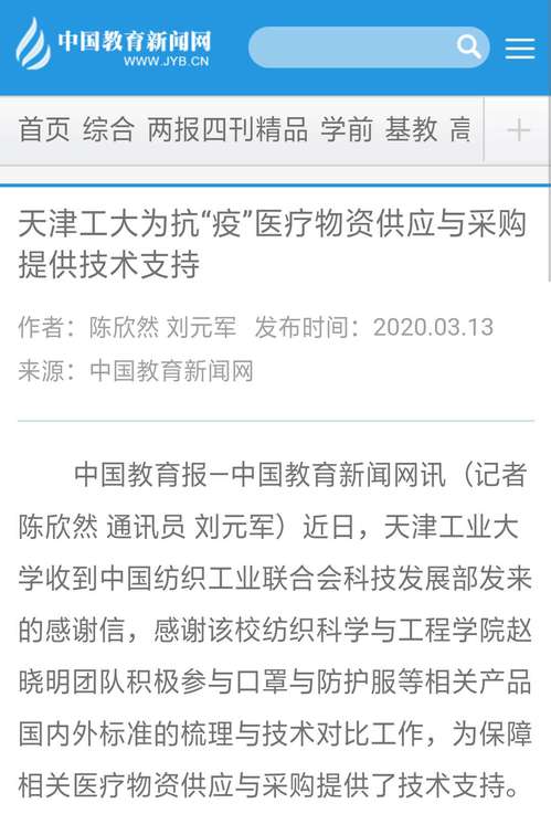 中国教育报—中国教育新闻网讯(记者 陈欣然 通讯员 刘元军)近日,天津工业大学收到中国纺织工业联合会科技发展部发来的感谢信,感谢该校纺织科学与工程学院赵晓明团队积极参与口罩与防护服等相关产品国内外标准的梳理与技术对比工作,为保障相关医疗物资供应与采购提供了技术支持。