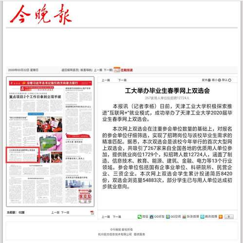 2020年3月22日《今晚报》第2版以《工大举办毕业生春季网上双选会 267家用人单位拟招聘12724人》对我校做了报道。现将全文转发如下,以飨读者。