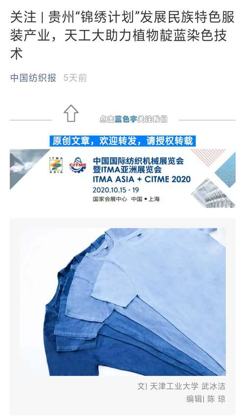 2020年4月14日《中国纺织报》微信公众号以《关注 | 贵州“锦绣计划”发展民族特色服装产业,天工大助力植物靛蓝染色技术》对我校做了报道。现将全文转发如下,以飨读者。