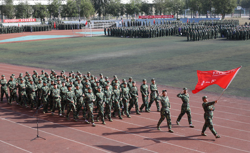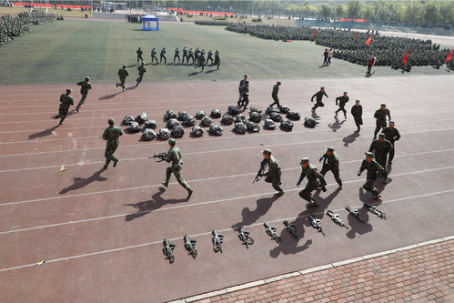 俞绍平书记下达分列式开始命令后,伴随着激昂的《中国人民解放军进行曲》,各营连方队高喊着响亮的口号,迈着整齐的步伐,接受学校领导和部队首长的检阅。随后,进行学生军训成果汇报表演,军体拳方队英勇飒爽;匕首操表演刚柔并济;战术演练分队密切协同,赢得全场阵阵喝彩和掌声。