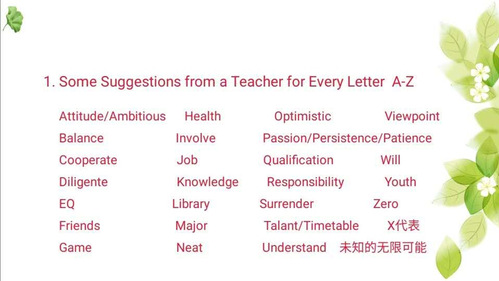 “未来的无限可能来自于你‘正面客观、积极乐观’的思维方式。”语言是文化的载体,在英语语言能力的学习中一定伴随有对不同国家与历史的了解和对中外现实与文化差异的认识。老师们在第一课精选抗疫视频、名言名句,以中国抗疫精神的伟大实践为例,帮助学生理解“没有什么困难不可以战胜,没有什么目标不可能实现”的深刻道理,在英语学习的同时引领学生具备正确的价值取向和科学的思维方式:只有自己“心之所向、行之所趋”,才有能力“各美其美,成人之美”,共同打造“美美与共,你我尽美”的人文天工和美丽中国。