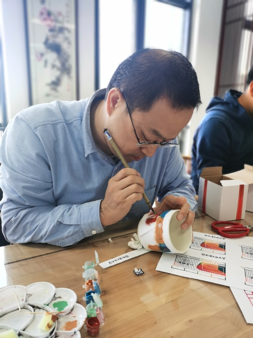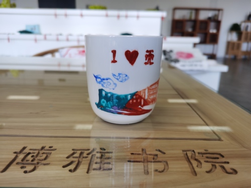 在专业美术老师的指导下,学院师生们通过手绘校景,在水墨丹青之间,把心目中最美丽的校园印刻在白瓷杯壁上。大家充分发挥自己的想象力和创造力,通过不同画面、不同意境的描绘,使校园的各种标志性建筑物,如望星体育场、公共教学楼、图书馆等跃然杯上。师生们轻托杯子,神情专注,先用素墨勾勒,运笔如行云流水般跳跃,再用绚烂的色彩描绘出校园的美丽。一件件作品,从不同角度展现出师生对美好生活的向往、蓬勃向上的精神风貌,对工作积极参与的态度和对校园的无限热爱。