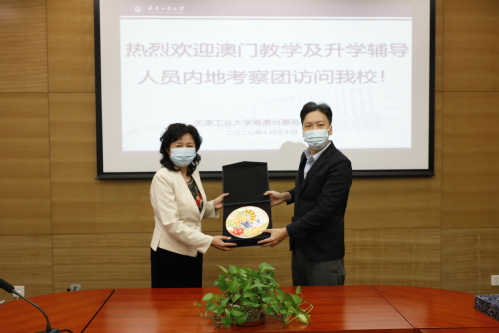 交流会开始,陈莉常务副校长对澳门考察团的到来表示热烈欢迎,简要介绍了学校的基本情况,回顾自港澳台事务办公室设立以来我校港澳台工作取得的成绩,展望未来我校和澳门的交流与合作,并表示热烈欢迎澳门学子报考我校。梁怡安处长代表考察团对我校的接待表示衷心感谢,同时介绍了澳门保送生政策的发展历史以及近年来澳门中学生报考内地高校的情况。双方分别代表天津工业大学和澳门教育暨青年局互赠纪念品。随后,王春红主任详细介绍了学校办学特色、优势学科以及近年来港澳台招生政策和情况等。