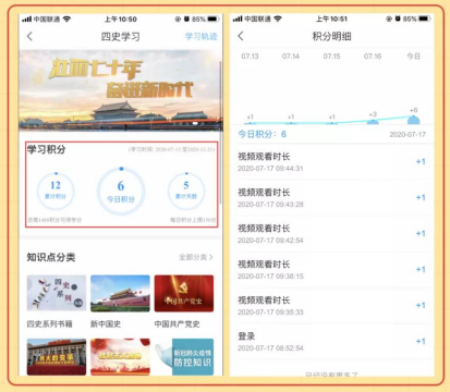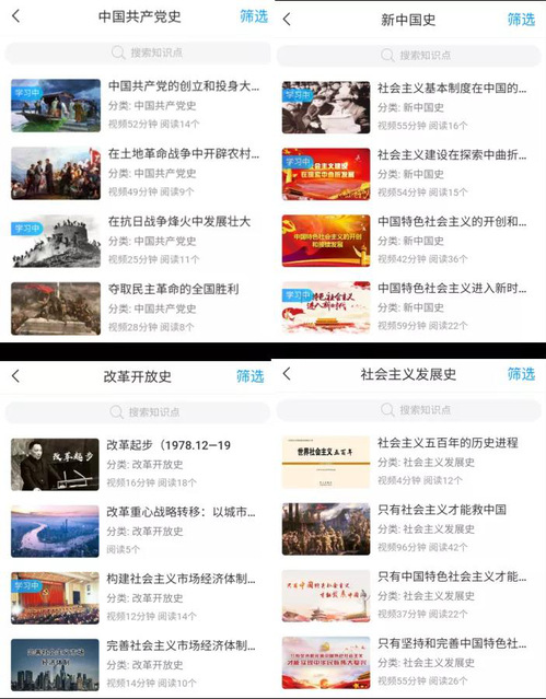 “四史”学习教育平台上内容专业严谨、生动详实。纵向为历史发展时期,横向为该时期重大事件、人物、文件。内容形式多样,声画优美,制作精良。主题式资源展示,标题分类清晰,可以挑着学。学习过程全纪录,学了就有积分。学校师生下载安装超星“学习通”APP,并进行注册认证后即可进行学习。
