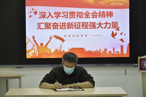 2020年11月12日,人文学院研究生党支部开展以“深入学习贯彻全会精神 汇聚奋进新征程强大力量”为主题的党日活动。全体研究生党员认真学习了党的十九届五中全会精神,领会新时期的新目标、新要求,为新征程积蓄底气和力量。人文学院党委副书记、常务副院长张兴国一起参加支部党日活动,为研究生党支部开展“十四五”精神宣讲,与研究生党员进行交流研讨,并寄语嘱托。