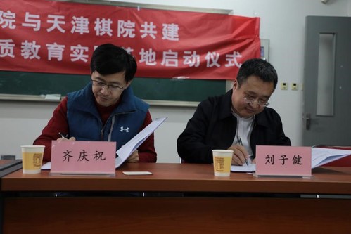 仪式上,学院党委书记齐庆祝与天津棋院院长刘子健签署大学生文化素质教育实践基地建设协议书。随后,齐庆祝书记与天津市体育竞赛和社会体育事务中心曹玉萍副主任共同为“大学生文化素质教育实践基地”揭牌。