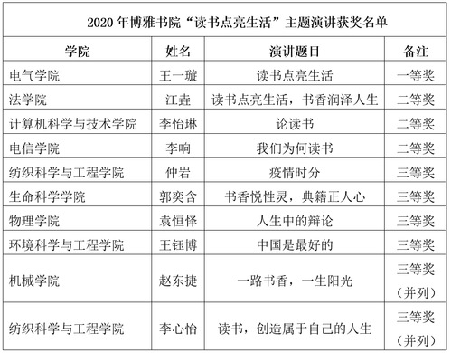 此次演讲比赛给同学们提供了一个展现自我、提升自我的舞台和机会,锻炼了同学们的口才与演讲能力,丰富了大学生的课余生活,展现了大学校园多姿多彩的文化氛围。同时,此次演讲比赛以“读书点亮生活”为主题,对我校浓厚读书氛围的形成起到了推动作用。(审稿人:博雅书院 倪娟 编辑:宣传部 柳婷)