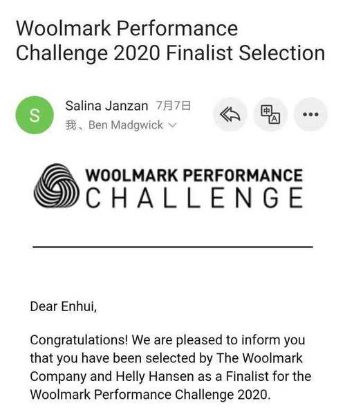 本届比赛竞争激烈,参赛者中不乏来自美国康奈尔大学、北卡罗来纳州立大学,英国爱丁堡大学,日本信州大学,德国亚琛工业大学,中国香港理工大学和东华大学等知名大学的优秀学生。组织者要求参赛学生展示利用澳大利亚美丽诺羊毛天然属性去开发生产新的原创产品、技术和生产加工解决方案。我校的许恩慧同学在刘建勇教授的指导下,从2019年11月份开始认真准备,克服新冠肺炎疫情带来的种种困难,最终于2020年7月份顺利提交了参赛方案,在其提交的方案中,从环保的角度展示了羊毛生物酶防缩的最新技术,并且将其与运动功能有机结合,征服了评委。