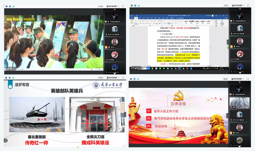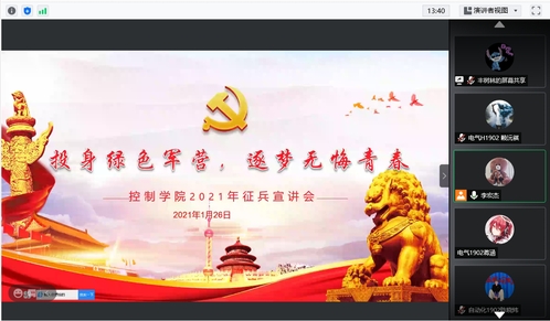 为响应国家号召,加强征兵工作宣传引导,鼓励大学生积极应征入伍踊跃参军报国,2021年1月26日,控制科学与工程学院开展了主题为“投身绿色军营,逐梦无悔青春”的线上征兵宣讲活动。学院党委副书记曾华英,武装工作负责老师李宏杰,辅导员薛凯,退伍士兵学生代表李建校、宋嘉辉以及各年级学生代表200余人参与。