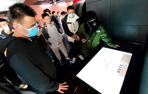 2021年3月22日中午,博雅书院二楼数字书法机旁围绕了各学院学生代表,大家一同观摩、学习、体验数字书法机的使用。