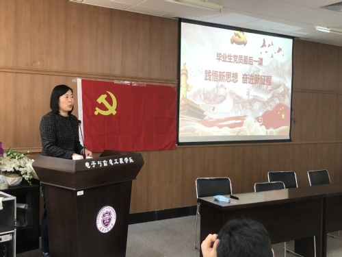 在毕业生党员教育大会上,郭翠娟书记以“只争朝夕,不负韶华”为主题给毕业生党员讲了离校前的最后一堂党课,叮嘱毕业生要时刻牢记党员身份,走向社会后进一步增强党员意识,更好地发挥先锋模范作用,常怀感恩之心,常为举手之劳,践行“全心全意为人民服务”的宗旨,不忘初心无惧风雨,牢记使命扬帆远航。听完郭书记的最后一课,毕业生党员纷纷表示,将以中华民族伟大复兴为己任,树立远大理想,勇于砥砺奋斗,让青春在为祖国、为人民的奉献中焕发出更加绚丽的光彩!(审稿:电气与电子工程学院 张谷 编辑:宣传部 李焕峰)