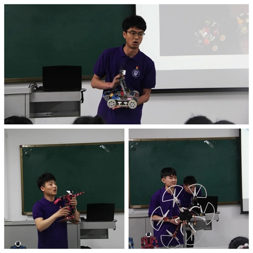 随后,水高庄小学的师生来到了机械工程学院E405教室,由大学生组成的宣讲团为小朋友们带来了一堂精彩的“机器人科普课”。竞速机器人、投篮机器人、足球机器人、舞蹈机器人、无人机、擂台武术机器人、水鱼机器人、自动叠衣服机器人、助老出行机器人一一闪亮登场,现场小同学们兴奋不已,宣讲团成员李志勇、蔡峰以及陈付磊同学带来了精彩生动的原理讲解与直观有趣的现场演示,小同学们也表现出了对机器人知识的浓烈兴趣。