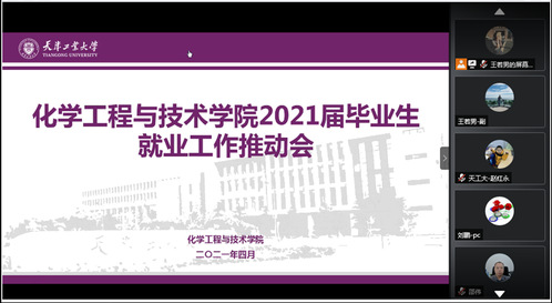 为贯彻落实中央、市委决策部署和教育部工作要求,积极落实学校就业推动会会议精神,加快推进毕业生就业工作,化学工程与技术学院于4月16日召开2021届毕业生就业工作推动线上会。学院党委书记王丽焕、党委副书记邵伟、学办主任陈虹、全体辅导员及2021届毕业班班导师参加会议。会议由党委副书记邵伟主持。