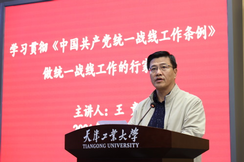 为深入贯彻中央、市委关于认真做好《中国共产党统一战线工作条例》学习宣传和贯彻落实,提高各级党组织和各级领导干部的统战意识,全面提升领导干部和统战人士的政治理论水平,2021年4月25日下午,我校举办《中国共产党统一战线工作条例》(以下简称《条例》)专题宣讲报告会。中央统战部培训中心特聘教授,市委讲师团领导干部宣讲员,天津市政协委员、市政协民族宗教专门委员会原主任、市社会主义学院原党组书记王竞教授作宣讲报告。校党委副书记胡英江,学校全体中层干部、统战干部,民主党派、统战团体负责人以及党外代表人士培训班学员参加报告会。报告会由胡英江副书记主持。