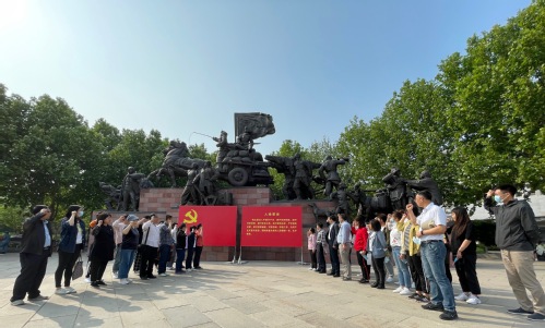 位于红桥区的平津战役纪念馆是天津市爱国主义教育基地和国防教育基地。在通向纪念馆公路的一侧,上世纪国产加农炮、坦克等大型仿真模型岿然挺立;纪念馆门前的广场中央,胜利纪念塔高高矗立,左右两侧的《人民支前》大型群雕、《并肩作战》大型群雕雄伟壮观,将师生带进那一段峥嵘岁月。随后,学院党委书记王国武带领党员重温入党誓词,在鲜红的党旗下庄严宣誓。