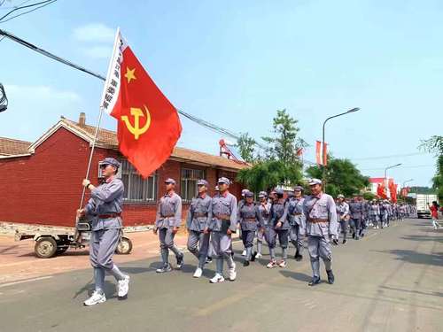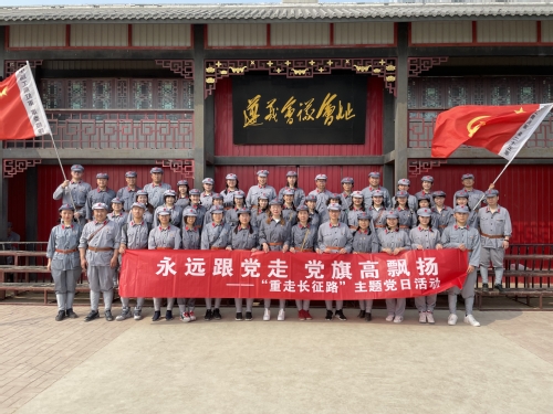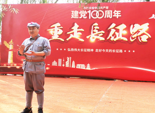 红五星、八角帽,党员们身着“红军军服”,佩戴“武器”,在广场上列队集合,举行授旗仪式,重温入党誓词。整齐的队伍迈着坚定的步伐,喊着嘹亮的口号,踏上了“长征路”。