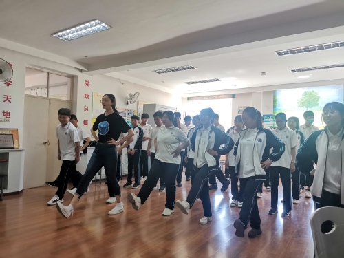 此次教学活动分为形体课程和美术课程教学,其中表演专业的徐添翼、冯馨谊、王艺颖及姜馨蔚进行形体课程教学。课程开始前,小老师们通过自我介绍来拉近与同学们的距离,在向同学们介绍完专业情况及课程内容后便开始了正式课程教学。首先,通过热身来活动肩颈,再利用让头部、双肩、臀部、小腿肚以及脚后跟紧贴墙面来进行不良站姿的矫正,提腿、踢腿、迈步……在老师们耐心地讲解示范后,学生们分组进行了步伐训练并展示了训练成果。
