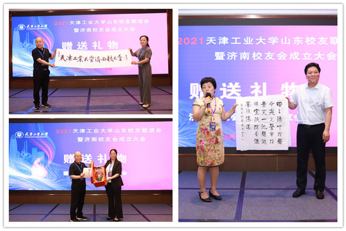 为祝贺济南校友会正式成立,校友企业翰墨轩、德州校友会等向济南校友会赠送书画作品及纪念品。济南校友会也向母校赠送了书法纪念品。