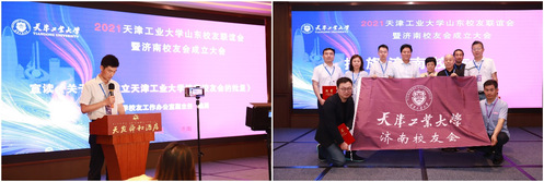 魏展副主任宣读《关于同意成立天津工业大学济南校友会的批复》,并主持表决《济南校友会章程》(草案)和济南校友会第一届班子成员人员名单(草案),参会代表以举手表决的方式一致通过。徐先林主任为济南校友会领导班子颁发聘书并授旗。