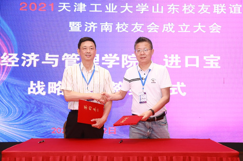 随后,优秀校友企业代表上海中禛网络科技有限公司(进口宝)与我校经济与管理学院签订战略合作协议。进口宝总裁吴会俊与经济与管理学院院领导孙涛代表双方进行签约。