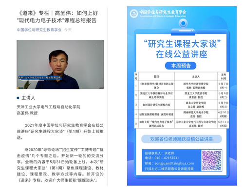 根据教育部、国家发展改革委、财政部发布的《关于加快新时代研究生教育改革发展的意见》(教研〔2020〕9号)文件精神,领会“加强课程教材建设,提升研究生课程教学质量”的重要性,围绕构建课程知识体系、规范课程设置,加强教材和示范课程建设、推进课程思政、评选优秀教材等主要内容,中国学位与研究生教育学会启动了“研究生课程大家谈”(第1期)在线公益讲座活动。我校电气与电子工程学院高圣伟教授于2021年6月11日应邀作了“如何上好‘现代电力电子技术’课程”报告,对电力电子类课程的现状、目标、意义、教学痛点进行了总结,提出了教学内容和教学方法的改进措施,并展示了教学成果。