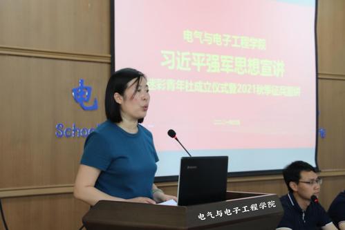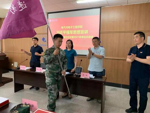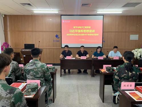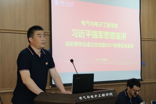 为深入贯彻落实习近平强军思想,为广大学生普及国防教育知识,鼓励在校大学生积极报名参军入伍献身国防事业,近日,电气与电子工程学院在A301室举行习近平强军思想宣讲、迷彩青年社成立仪式暨2021秋季征兵宣讲。学校人民武装部部长张志勇,电气与电子工程学院党委书记郭翠娟、党委副书记张谷,相关老师、学生办辅导员、应征入伍适龄青年代表、国旗护卫队代表、迷彩青年社第一届成员共计120余人参加会议。会议由学生办主任薛高建主持。