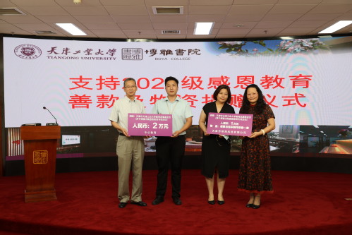 首先,博雅书院院长肖强、常务副院长尚绪芝代表书院接受捐赠。中公教育为我校2021级新生感恩教育捐赠善款2万元。天津市褀海科技发展有限公司为我校2021级新生感恩教育捐赠善款1万元和马克杯制作设备一套,该公司已为我校2020级新生感恩教育捐赠善款2万元,这是其第二次捐赠。